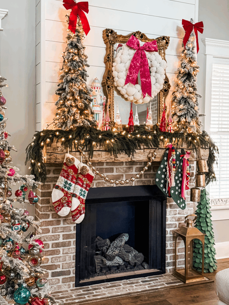 But perhaps my favorite part of this mantel is the glass trees cascading across the greenery. If I am remembering correctly, I got the red and pink ones at Walmart last year, but I can’t remember where I found the red and white ones.