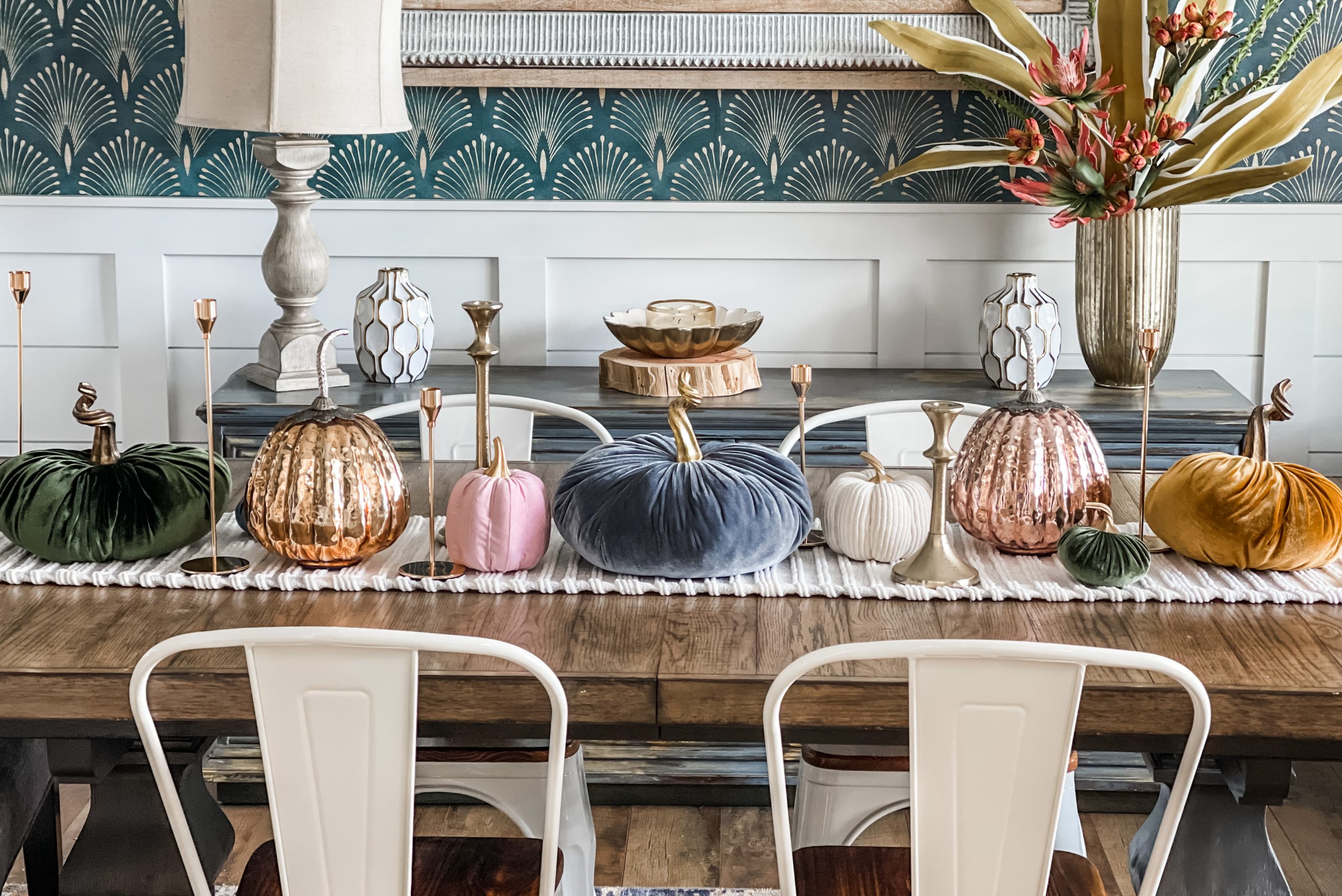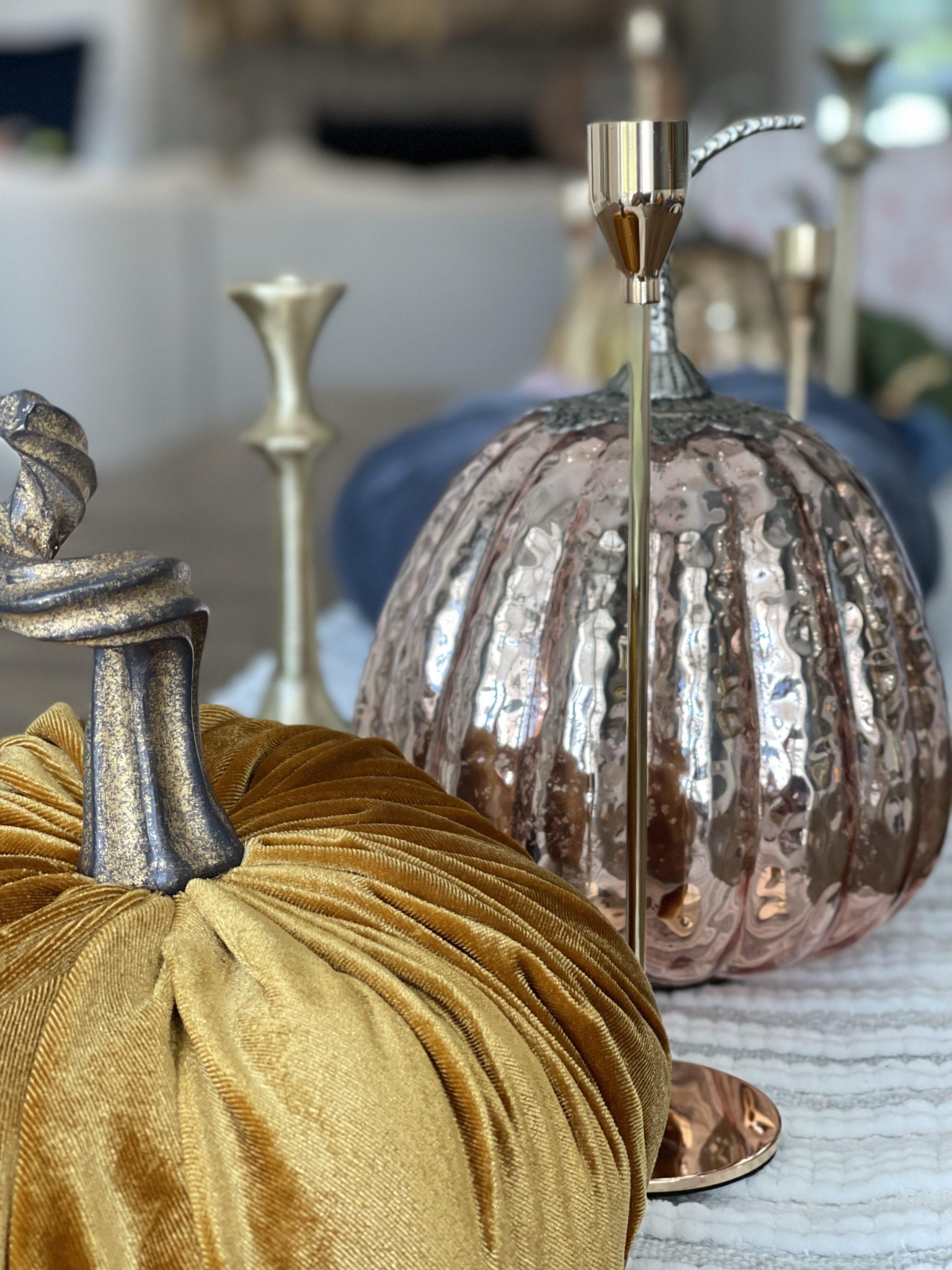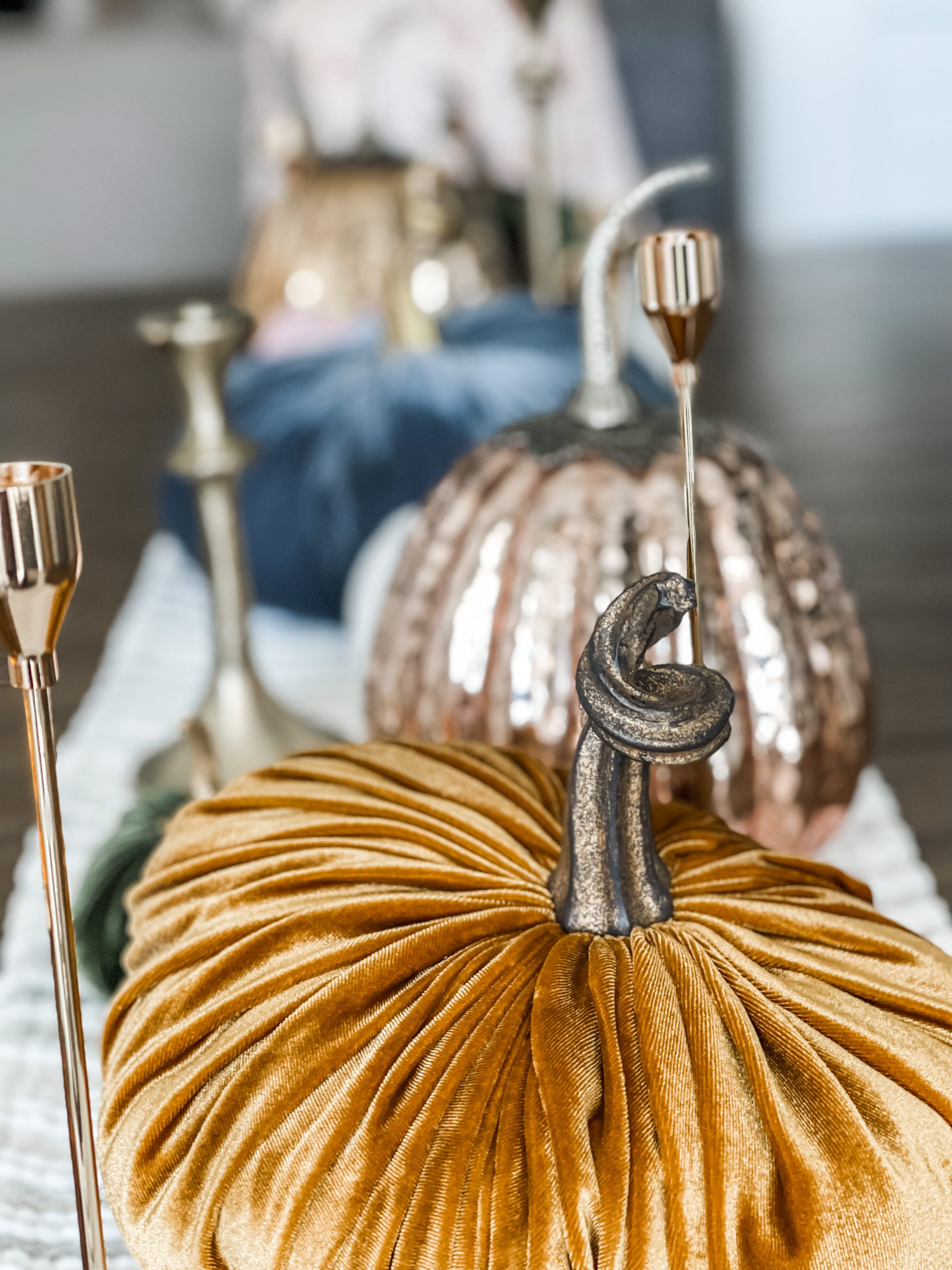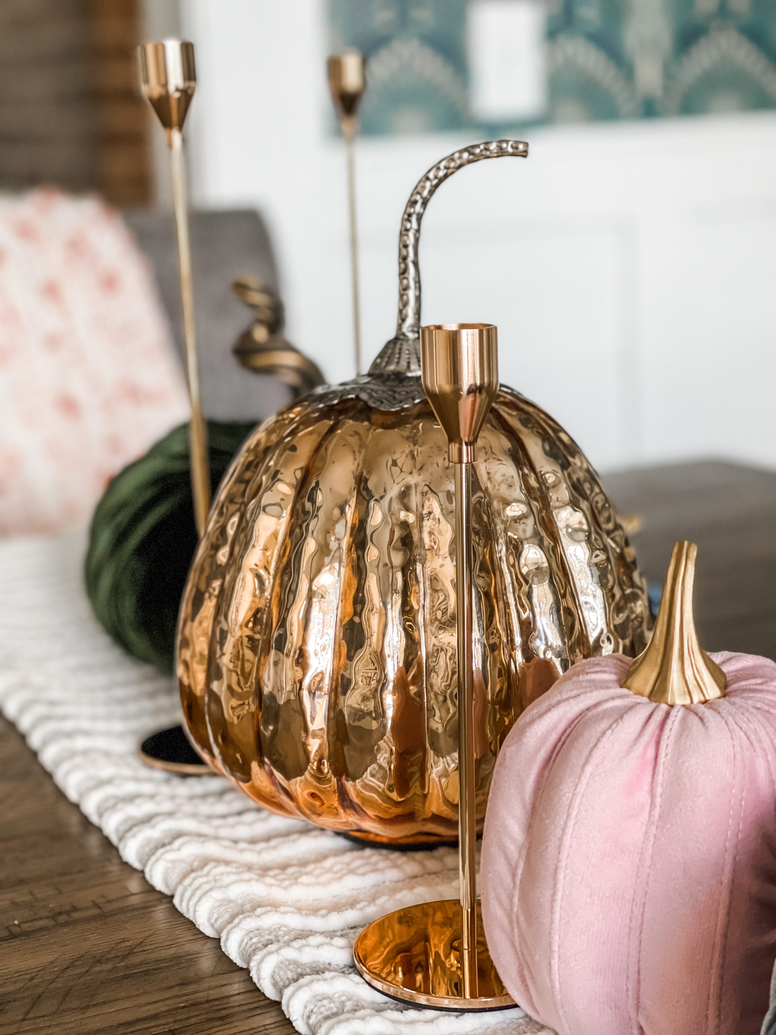 Sometimes, for the perfect Fall tablescape (if that is the word you even want to use for this), all you need is some colorful pumpkins and gold candlesticks!