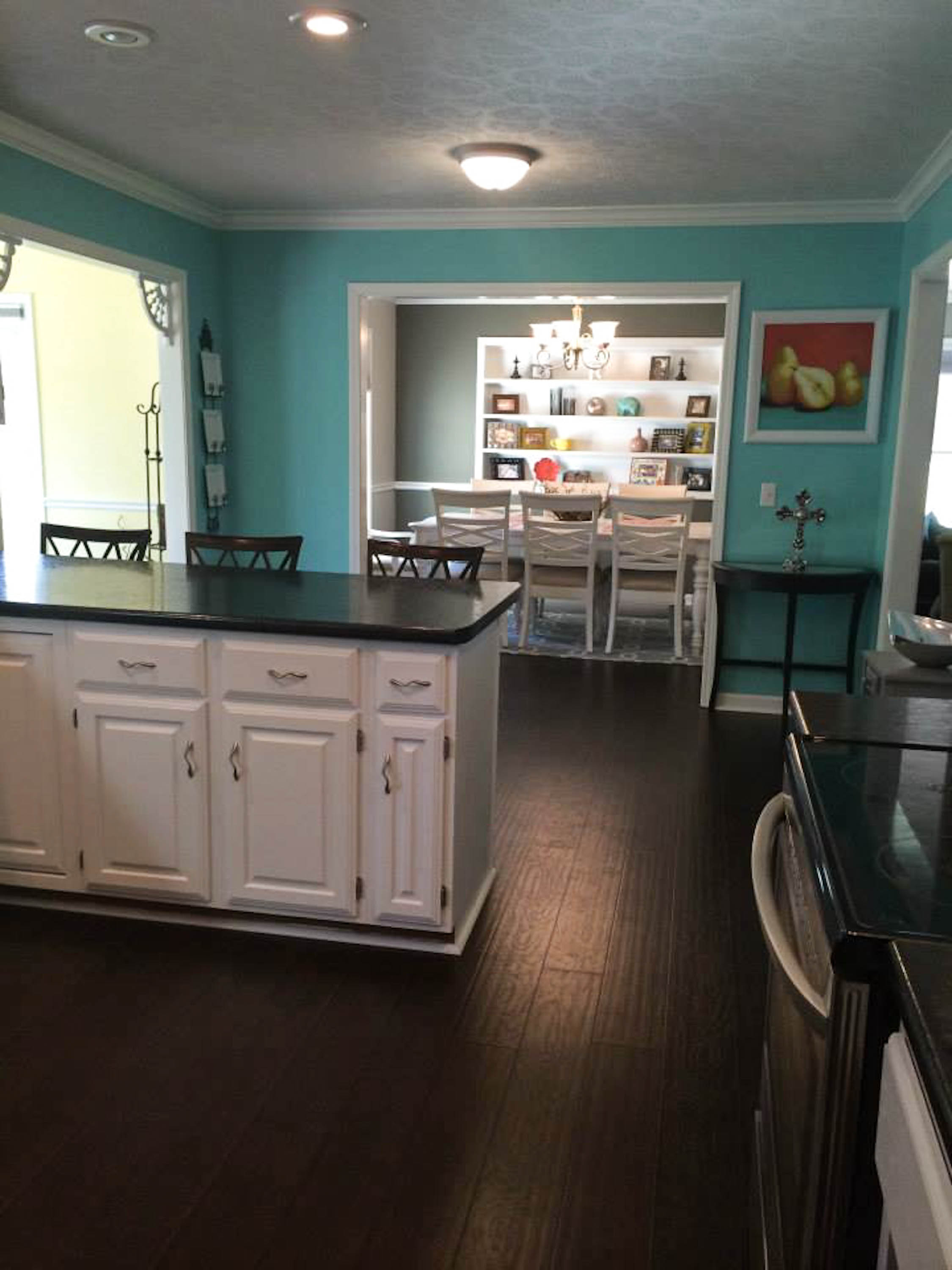 Wow!…The kitchen looks beautiful!…Love the colors and the blend into the dinning room…You could add some crown molding above the cabinets and it gives more off a custom look, I did it to mine and it made such a difference…All the rooms look awesome!